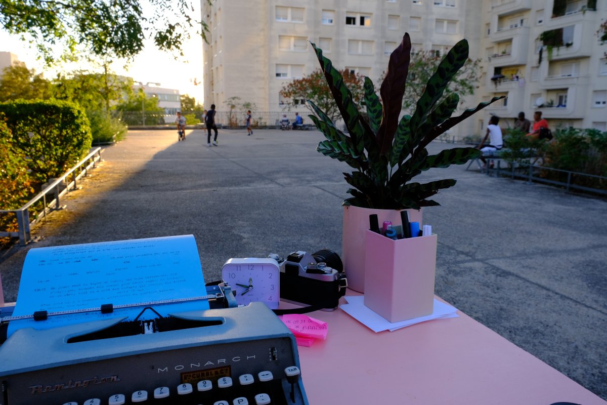 Charlotte a mis en place en 2019 une performance d’écriture dans l’espace public. Après plusieurs jours d’immersion anonyme, elle photographie en argentique ce qu'elle ressent de ce quartier. Ensuite, elle installe un bureau éphémère, sur un croisement de rues et écrit. La machine à écrire lui permet d’ancrer/encrer le présent instantanément.