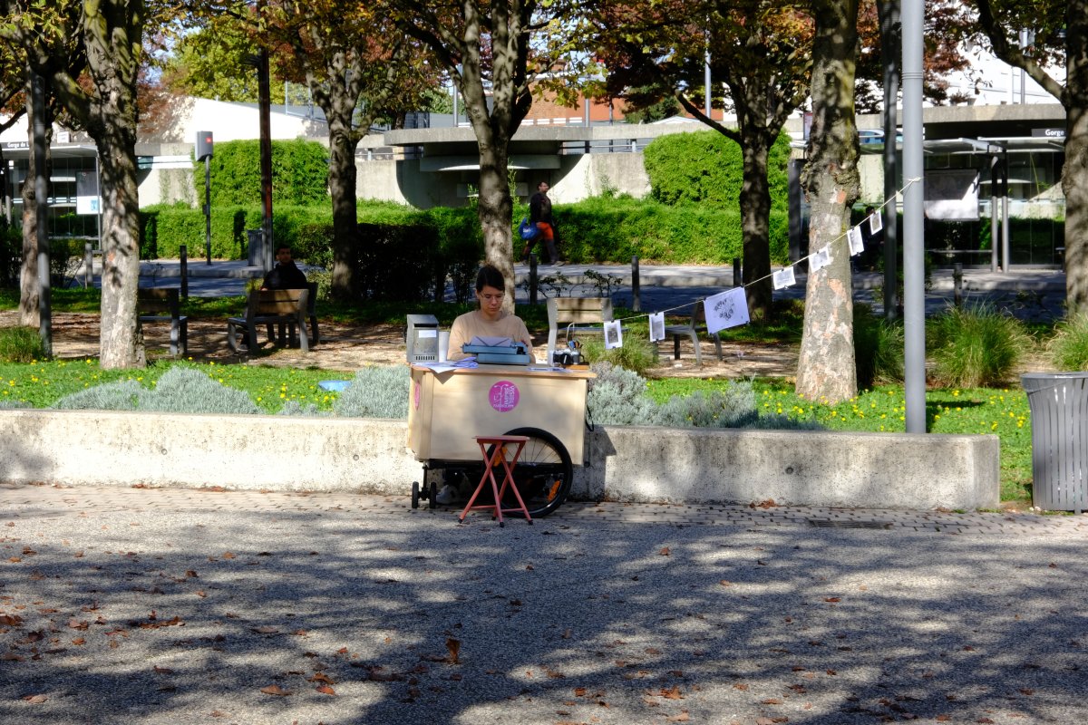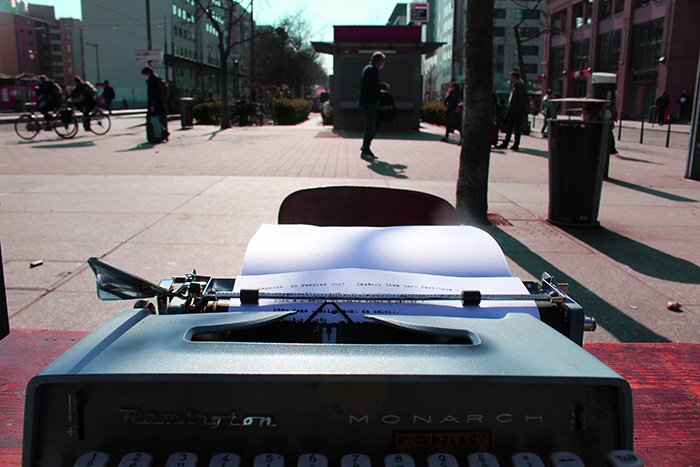 Dispositif artistique : Installation in situ à la machine à écrireMots clés : machine à écrire, espace public, implication citoyenne