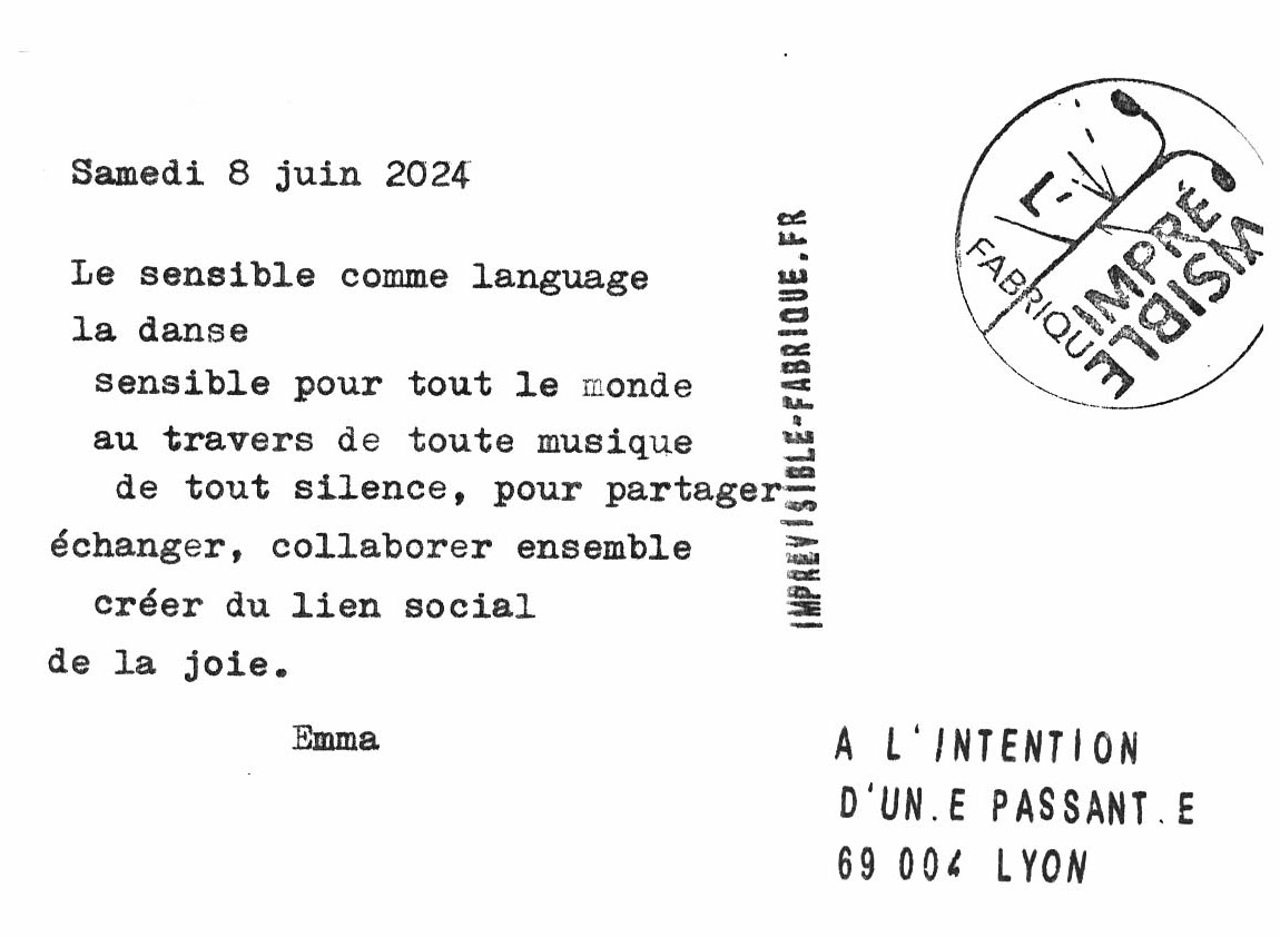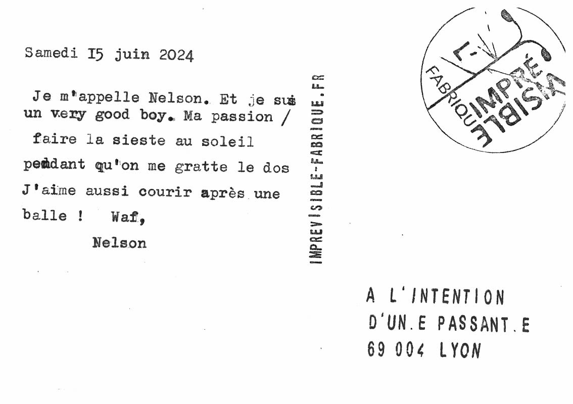 Lors de ses premières installations, les habitants souhaitaient eux aussi écrire sur la machine, Charlotte a donc proposé un dispositif où ils créent une carte postale à partir d’une photographie qu’ils prennent du quartier. Les cartes créées sont à l’intention d’un passant du quartier qui la découvrira déposée (oubliée) sur un mobilier urbain.