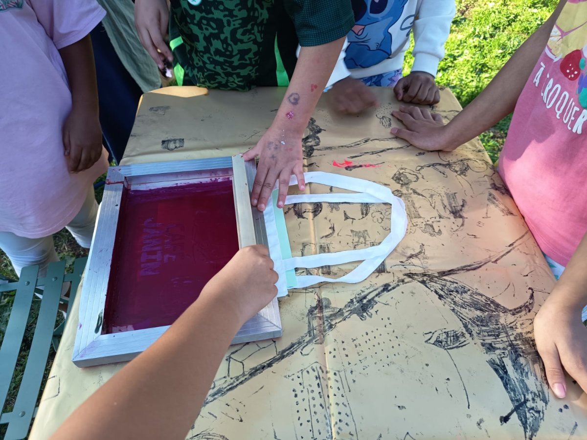 - Découverte de la sérigraphie sur Tote bag ou chacune est reparties avec (25 tote bags réalisés) et sur Tee shirt avec les jeunes du chantier.