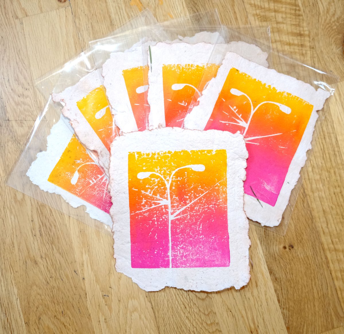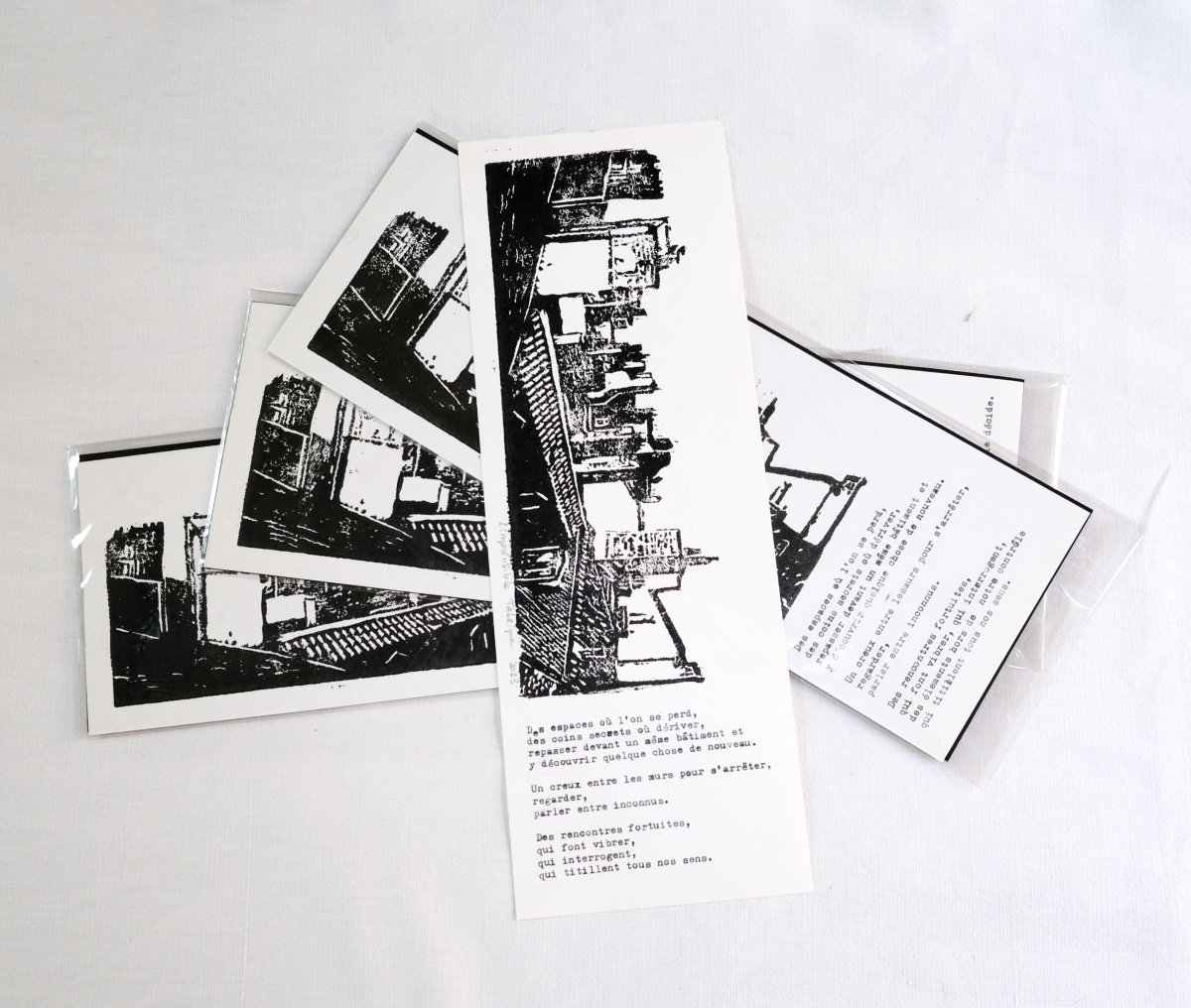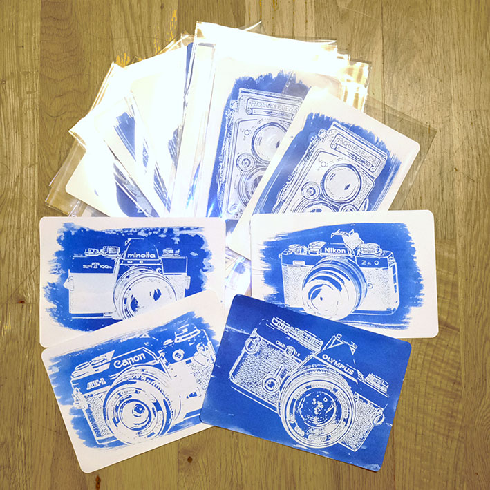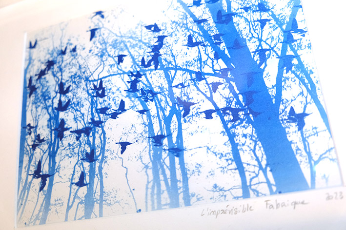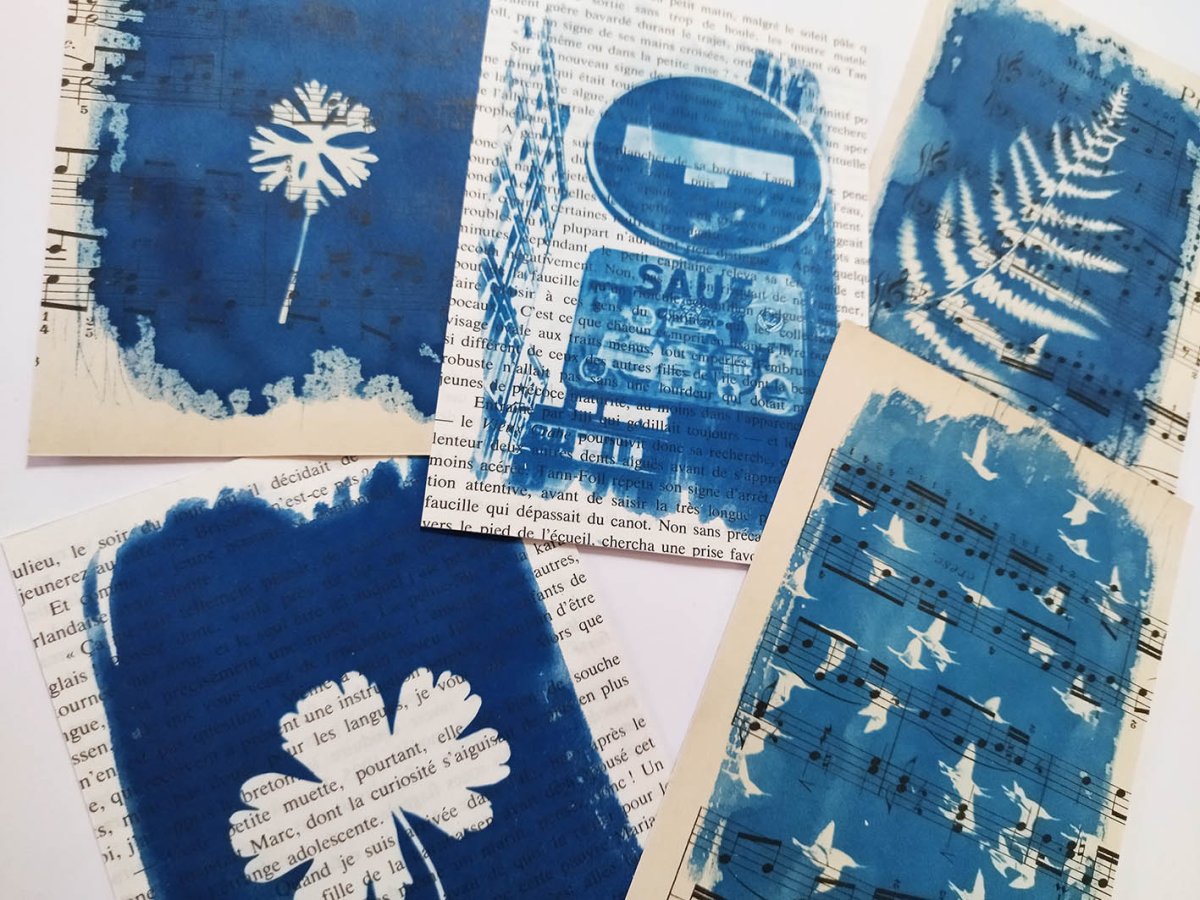 Tout est fait mains, avec des techniques de cyanotype, linogravure, teinture végétale etc ...